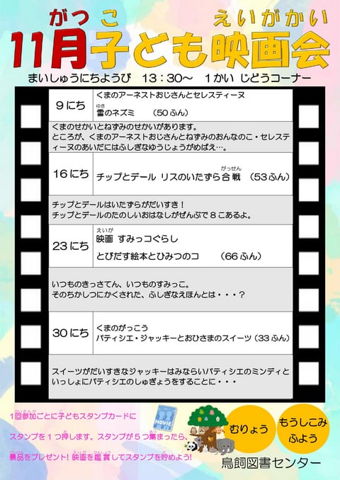 【鳥飼】11月映画会スケジュールは以下の通りです。