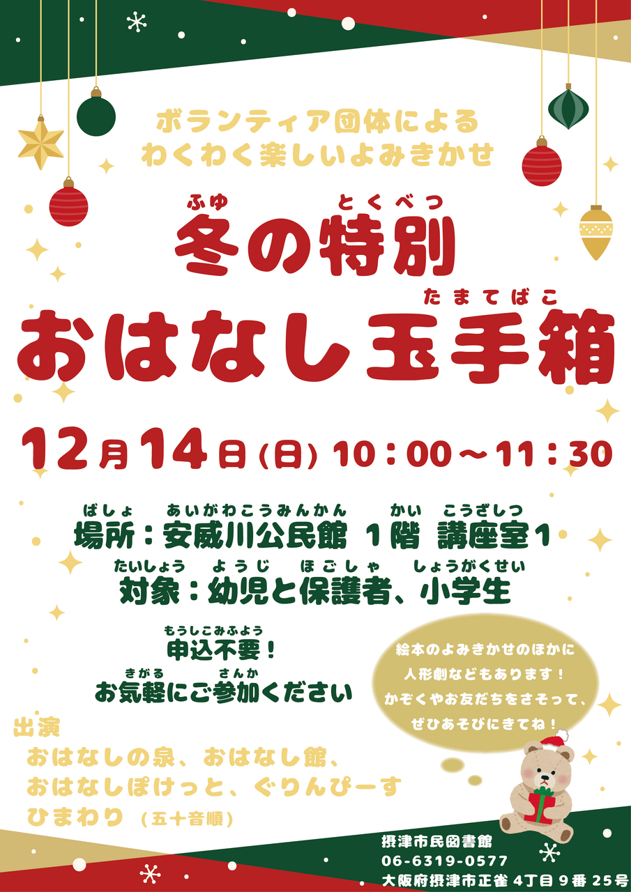 摂津市民図書館では、ボランティア団体合同による、冬の特別おはなし玉手箱を行います。