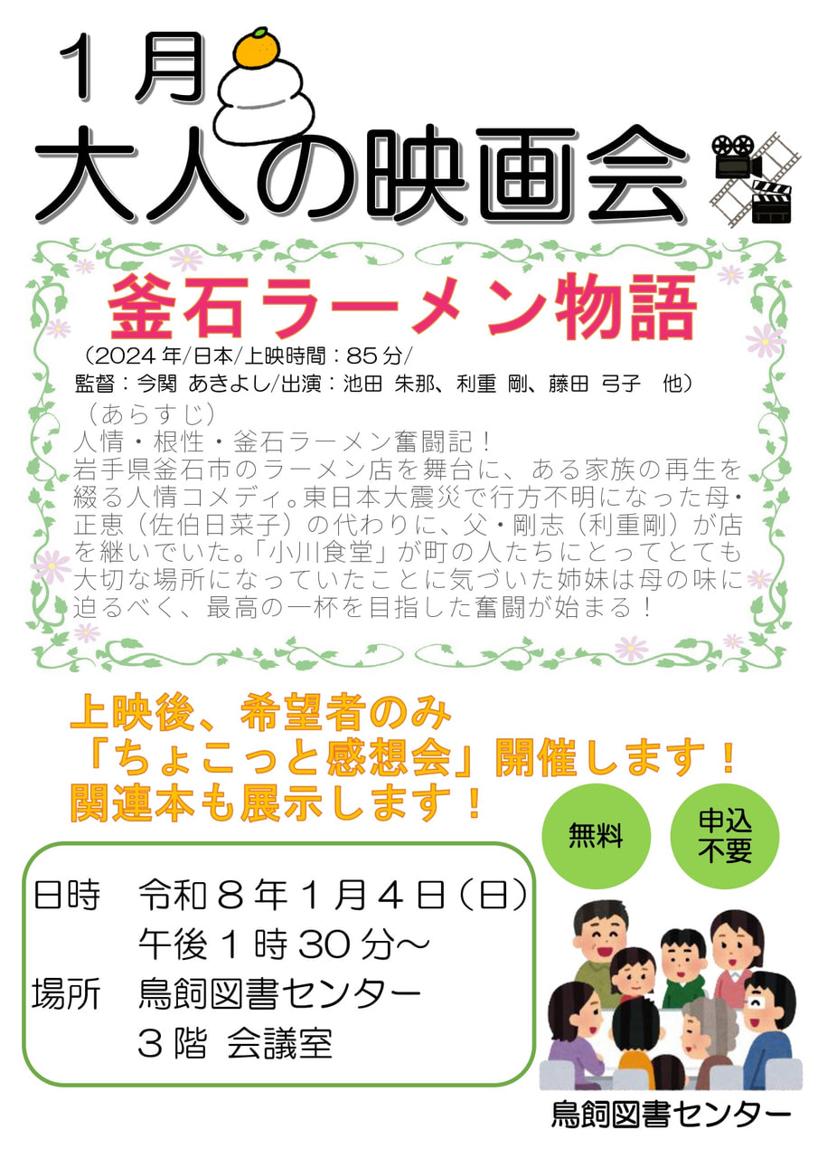 【鳥飼】1月映画会スケジュールは以下の通りです。