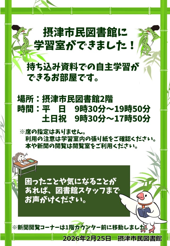 この度、トイレ改修工事完了に合わせまして、摂津市民図書館内に学習室を設置いたしました。