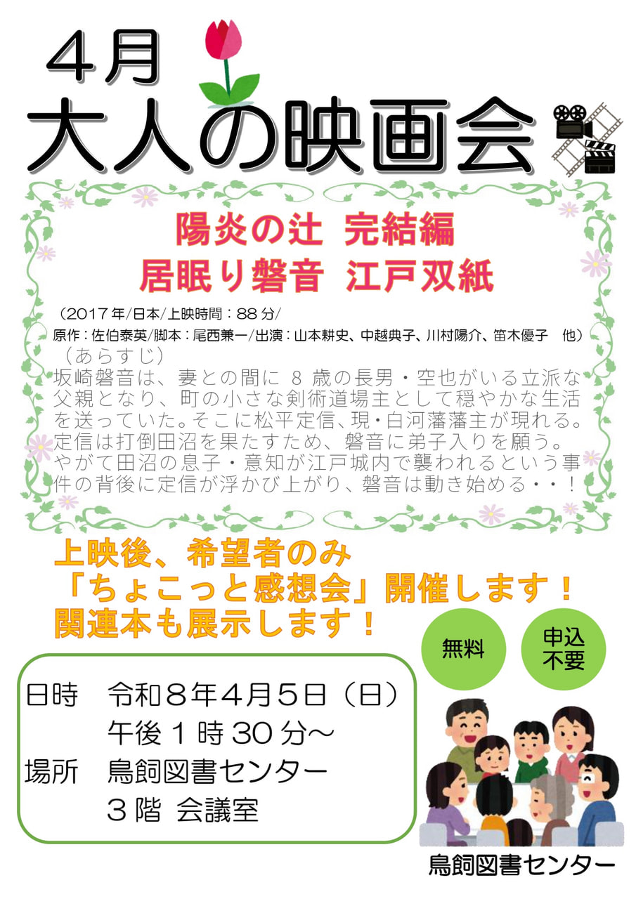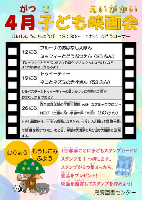 【鳥飼】4月映画会スケジュールは以下の通りです。