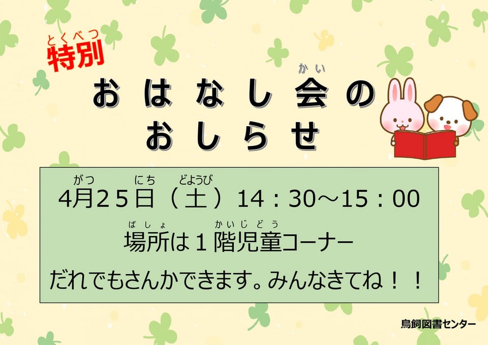 ※電話申込は不可。鳥飼図書センター1階カウンターにてお申し込み下さい。