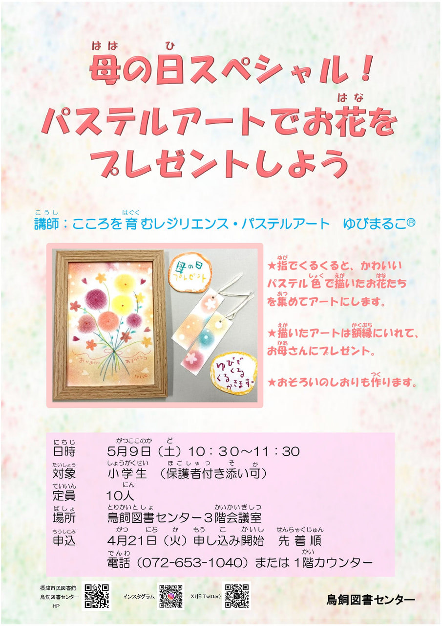 【鳥飼】母の日スペシャル!パステルアートでお花をプレゼントしよう🌷 2026年4月10日 鳥飼 指でくるくると、かわいいパステル色で描いたお花たちを集めてアートにします。 日時:5月9日(土)10:30~11:30 対象:小学生 ※保護者同伴可 申込:4月21日(火)~ 電話・カウンターにて 定員:10人